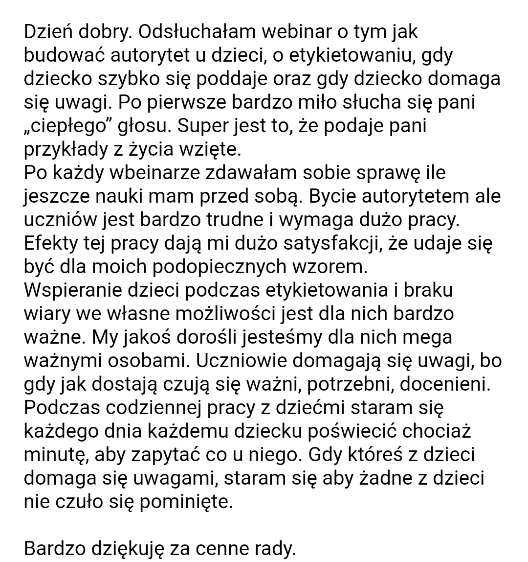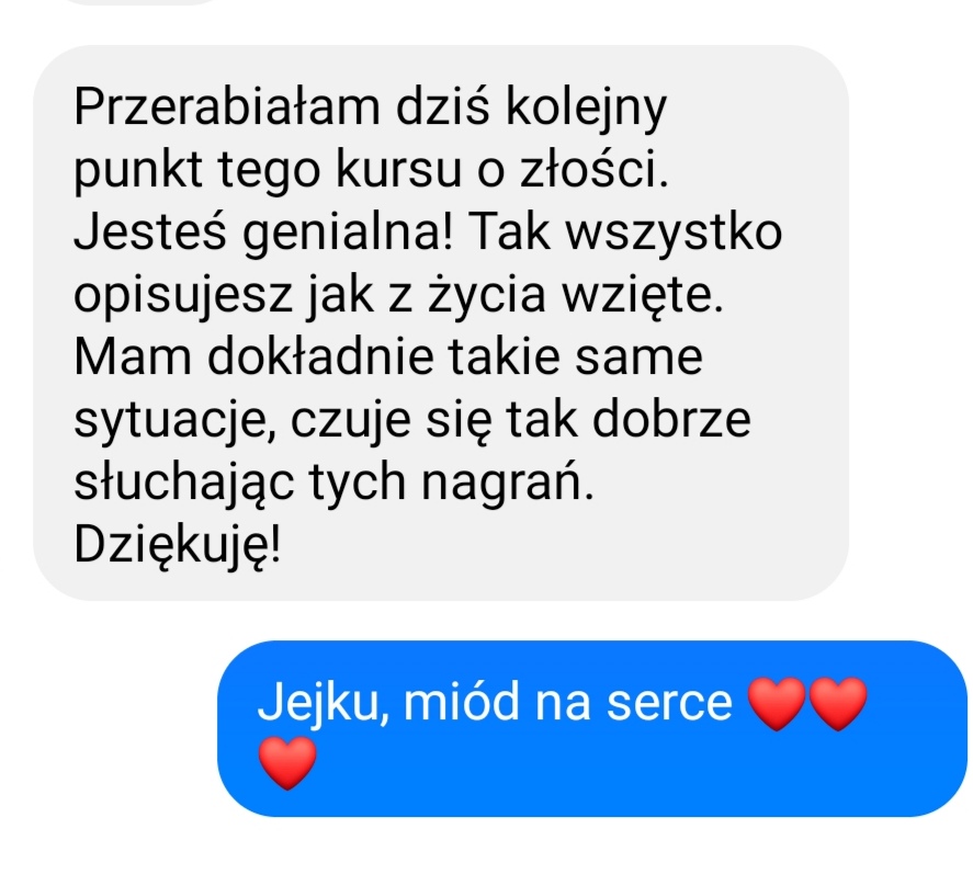 Wspaniały kurs, obszerna wiedza na temat budowania relacji. Dla mnie forma online i możliwość odsłuchania kursu w dogodnym terminie była zbawienna, dzięki temu mogłam poświęcić sporo uwagi całej treści spotkań. Kontakt z prowadząca bardzo dobry, co dla mnie ma ogromne znaczenie przy kursach online. Bardzo dziękuje i szczerze polecam!