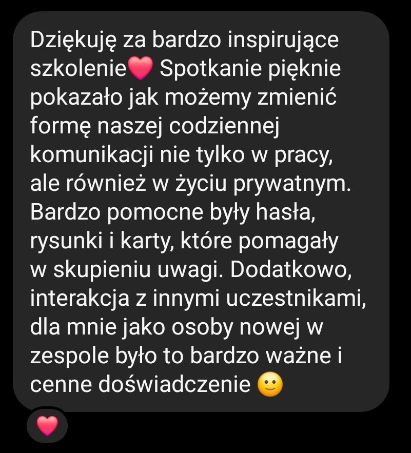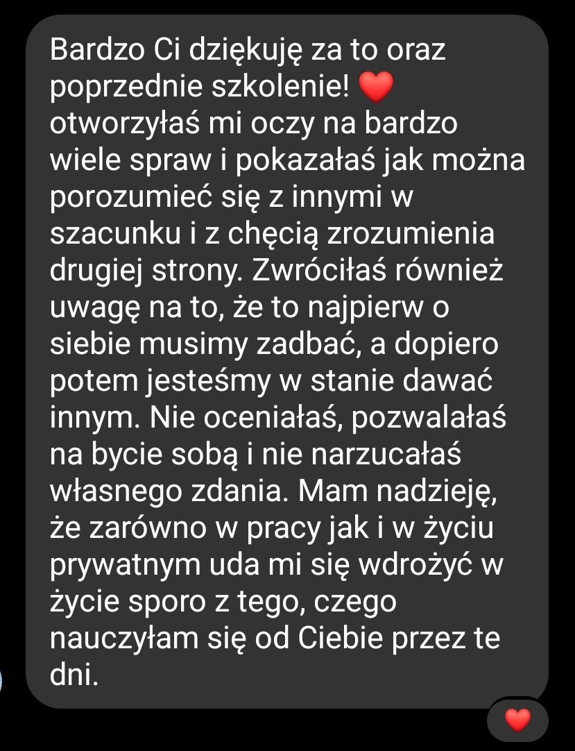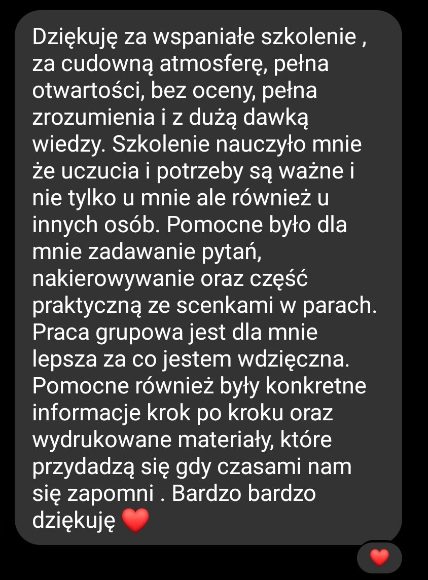 Kurs przypomniał nam jak ważny jest szacunek i otwartość na drugą osobę. Nasze kolejne bezsensowne kłótnie zastępują coraz częściej szczere (czasem do bólu!) rozmowy. Dostaliśmy mnóstwo cennych wskazówek, które powoli wdrażamy i widzimy efekty! ❤️